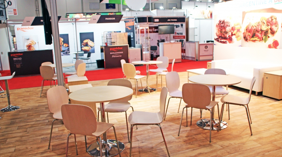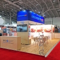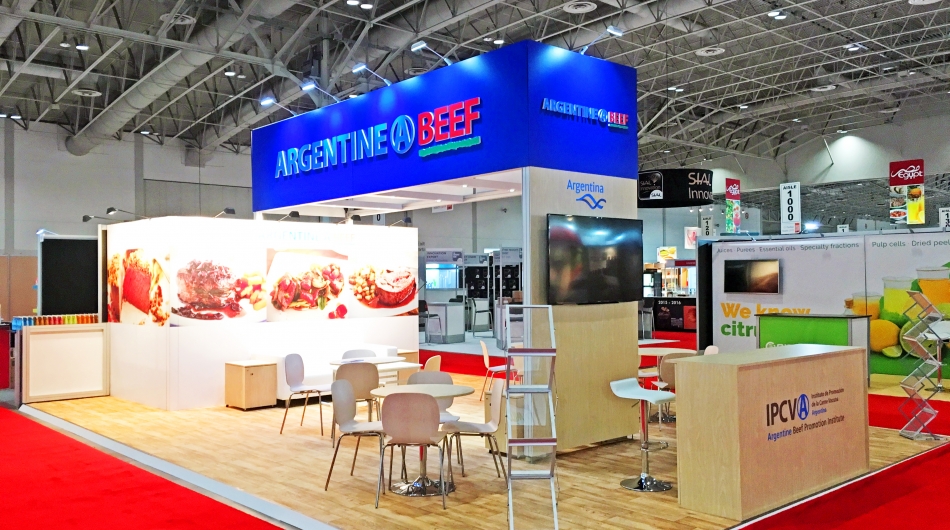 Stevens developed a solution utilizing mostly rental elements to construct a booth that fit within the harmony of the clients existing brand, thereby extending their brand to within the Canadian marketplace. Large visuals applied to a rental laminate wall allowed for excellent brand recognition along with dimension 3D cut letters mounted to the surface of a large overhead structure that allowed for distance visibility. A kitchen was incorporated into the storage area of the exhibit allowing the client to prepare light food and coffee for visitors. A large video monitor behind the front reception provided for continuous looping video of presentations.