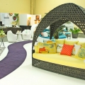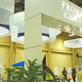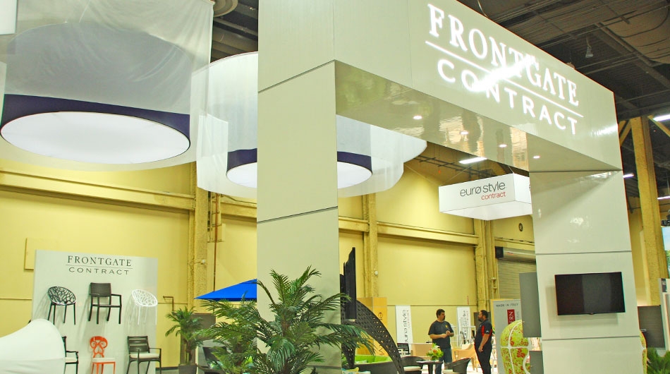 Stevens E3 was able to successfully design an environment that was clean, bright, and uncluttered with clean traffic flow that carrying attendees through the pavilion. The use of high gloss flooring, and gloss white laminate created a shine to the exhibit, and a look of luxury. A raised section of flooring 10 ft in diameter was created and lit to create a floating look to the platform that would feature a new product that Frontgate was bringing on to the market. Suspended fabric ceiling elements hung over the booth with the large purple cylinders being backlit, thus helping to create the overall environment and draw crowds of attendees. A large backlit sign with illuminated lettering and a large span across the centre of the exhibit was to be a feature entrance point. The exhibit and signage could be seen from multiple aisles away.