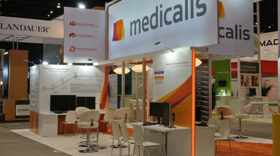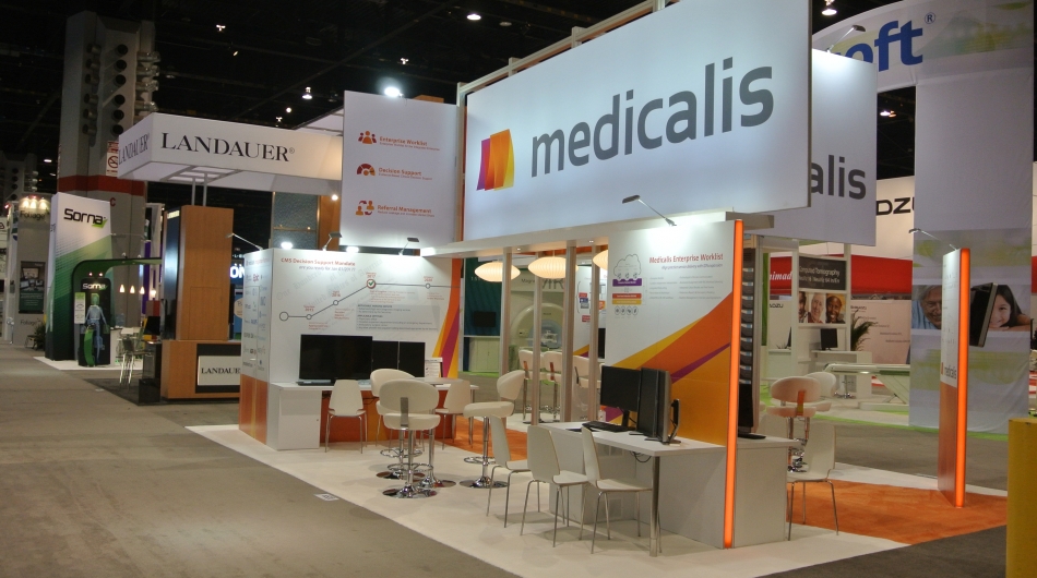 Design a Rental Exhibit with a strong Medicalis branding to attract attention across the exhibit hall. An open and spacious layout was needed to accommodate high volume of attendees and multiple presentation areas within the booth space. A secure server room was also required for housing computers and equipment, as well as additional storage space. Flexibility was a key element as the exhibit is to be used at multiple shows requiring different brand messages.