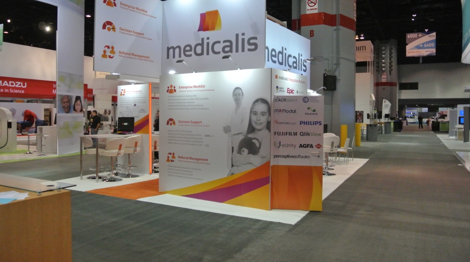 Stevens E3 designed a streamlined and attractive custom/modular rental exhibit, showcasing the Medicalis branding for graphic colours and style. The booth components and layout were kept functional, emphasising traffic flow and leaving ample room for Medicalis staff and show attendees. The Server Room was designed using the small space efficiently, ensuring proper air circulation and cord management. High impact Graphics, printed on a combination of fabric and rigid substrates, can be individually revised for future shows and target audiences.