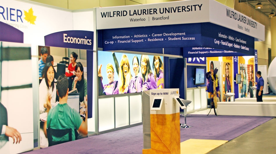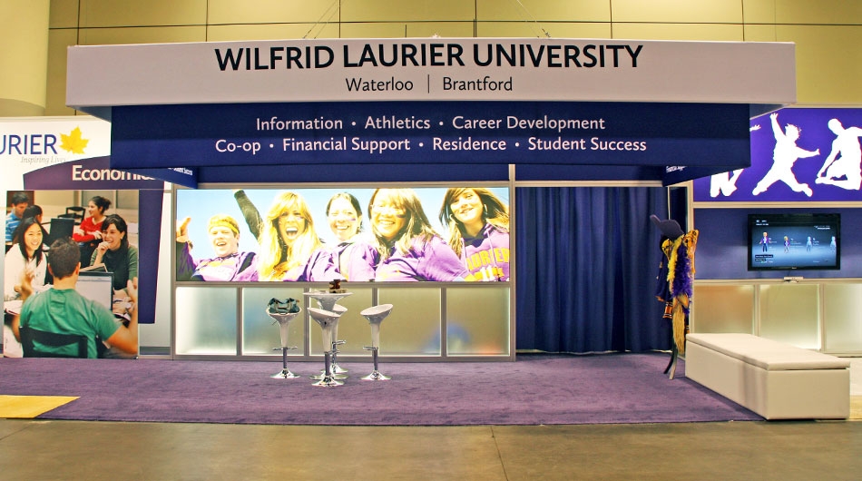To design an exhibit that considers Wilfrid Laurier University's vision, while ensuring that the exhibit reflects a true sense of their two campuses in a way that engages their target audience. Over a three-day period, 120,000 attendees visit the OUF to evaluate and compare 21 post-secondary institutions. The exhibit needed to present the community and academic traditions at Wilfrid Laurier. A key strategy was to gather as many student contacts as possible, and to clearly show a wide range of academic programs. A balance of student life and community was to be interwoven into the informative elements of the environment. An open, welcoming space with strong branding was the primary objective.